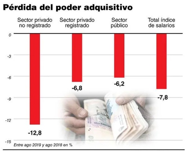 Hubo un tipo de salario que sufrió una caída incluso superior: los sueldos del estado registraron un deterioro de 2,1% real, ya que subieron apenas 1,8% en términos nominales. Pero los que más se derrumbaron en el último año fueron los no registrados; ahí la caída alcanzó el 12,8% interanual en agosto.