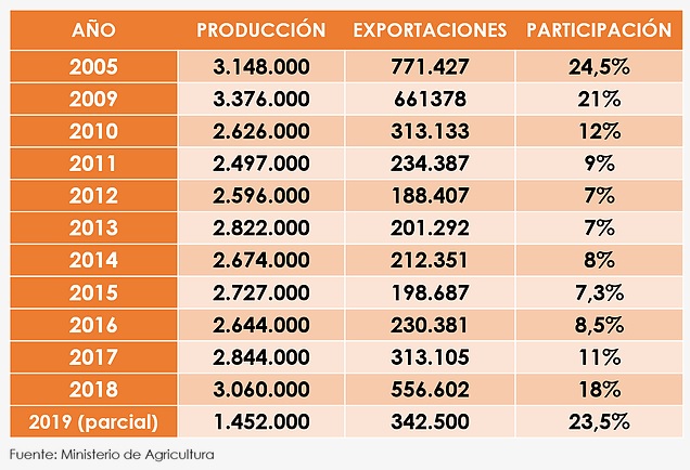 En el cuadro adjunto se observa la evolución de la producción y de las exportaciones de carne vacuna desde 2005 cuando todavía no había arrancado la intervención en los mercados, luego vino la seca y mucho más tarde el cambio de Gobierno y de políticas. Todos esos procesos alteraron la relación entre producción y exportaciones.