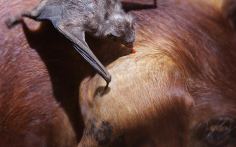 El vampiro se alimenta de la sangre de los animales modiéndolos en lugares que les resulta difícil espantarlos, como detrás de las orejas, la cruz, la base de la cola, la ubre, los pezones, etc. Si el vampiro está incubando rabia se la contagia de esta forma al ganado.