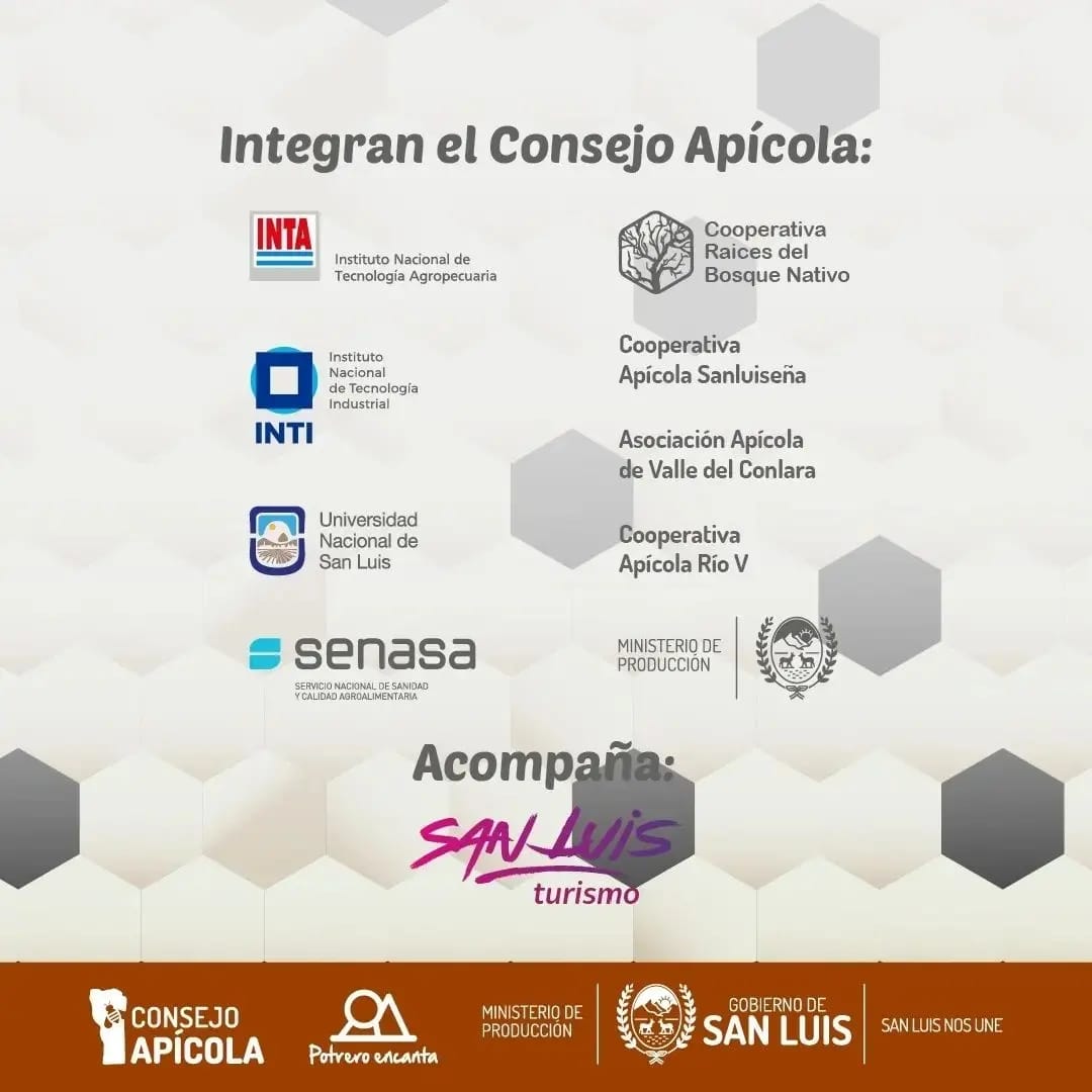 El Consejo Apícola Provincial está integrado por organismos como el Instituto Nacional de Tecnología Industrial; Instituto Nacional de Tecnología Agropecuaria; Servicio Nacional de Calidad y Sanidad Agroalimentaria; Universidad Nacional de San Luis; Cooperativa Apícola Río V; Cooperativa Raíces del Monte Nativo; Cooperativa Apícola Sanluiseña; Asociación Apícola de Valle del Conlara y Ministerio de Producción.