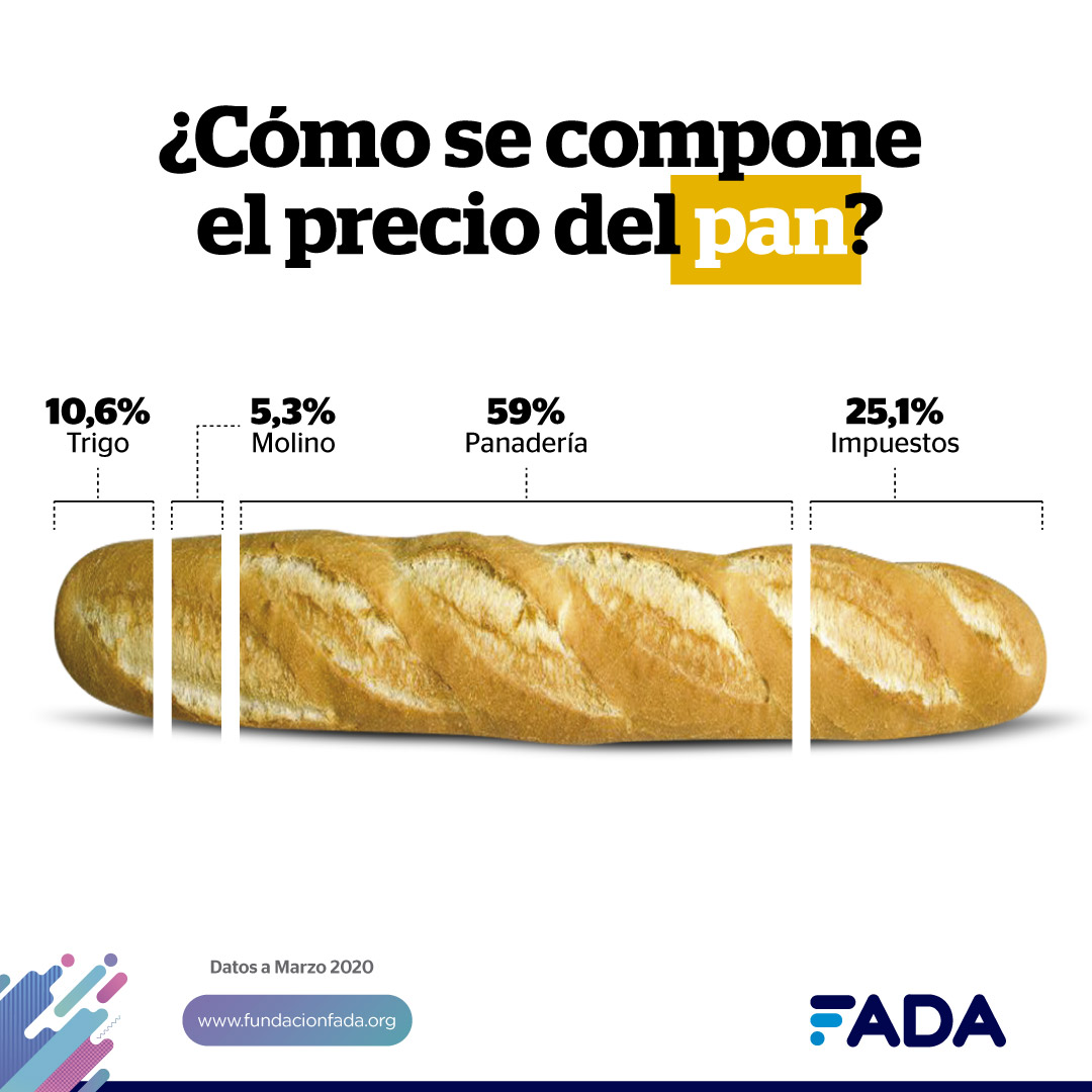 El 10,6% del precio del pan corresponde a costos de producción más resultado económico del cultivo de trigo, el 2% son impuestos sobre la producción y el 87,4% restante del precio del pan está compuesto por la etapa del molino, la panadería y los impuestos de dichas actividades, incluido el IVA.