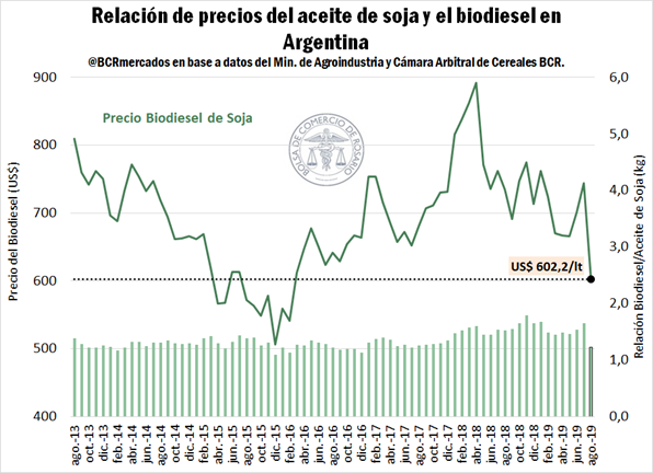 El precio del biocombustible había sido fijado en $ 31.549 por tonelada en agosto, sin modificaciones respecto del precio en pesos establecido para julio. Sin embargo, a diferencia del mes precedente, en agosto el dólar se apreció un 25% frente al peso argentino y el valor de la soja tuvo una suba más pronunciada, alterando consecuentemente la rentabilidad del mercado del biodiesel. De esta forma, el precio del biodiesel para el mes de agosto medido en dólares cayó a US$ 602,2/t, convirtiéndose en un mínimo en más de tres años, desde febrero 2016.