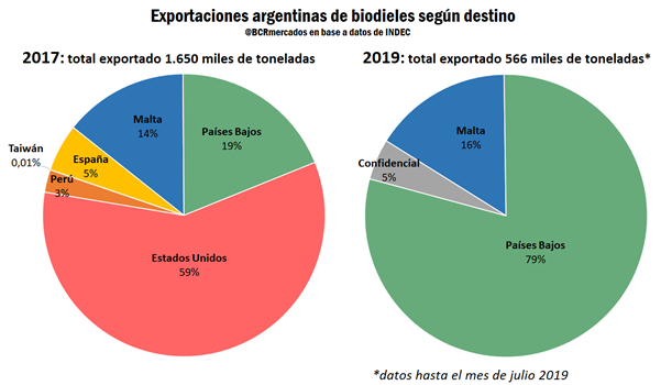 En 2019 las exportaciones argentinas de biodiesel se estiman en 1.200 millones de litros, el volumen más bajo de los últimos 3 años. La cifra denota una importante caída respecto de los despachos de 2018, que a su vez habían sido muy inferiores a los del año anterior. En cuanto a los destinos de estas exportaciones, aproximadamente el 95% del total iría a la Unión Europea.