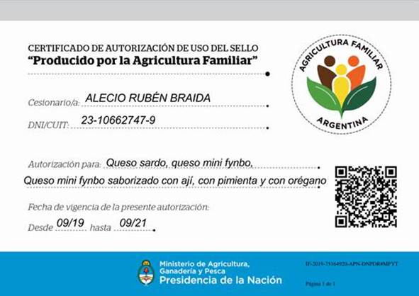 El Ministerio de Agricultura, Ganadería y Pesca de la Nación, a través de la Secretaría de Agricultura Familiar, Coordinación y Desarrollo Territorial, autorizó el uso del Sello «Producido por la Agricultura Familiar» a Raquel Lamy de Braida y Alecio Rubén Braida quienes se dedican a la cría de ganado bovino y producción de quesos artesanales.