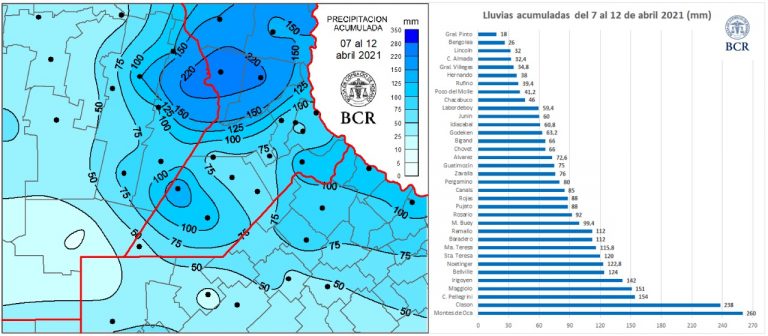 El último evento de lluvias que comenzó el jueves 8 de abril y se extendió hasta el domingo 11 sorprendió a todos. Si bien la distribución de las lluvias fue la esperada, el volumen de agua dejó marcas récords. En la región núcleo se esperaba algo más de 30 a 40 mm pero el evento dejó casi 100 mm en promedio. Puntualmente, hubo registros de más de 250 mm. En la red de estaciones GEA / BCR, Montes de Oca totalizó 260 mm, Classon le sigue con 238 mm. Luego hay 10 localidades entre el centro y sur de Santa Fe y el este de Córdoba con acumulados de 100 a 150 mm. En Marcos Juárez, la medición del SMN fue de 253 mm.