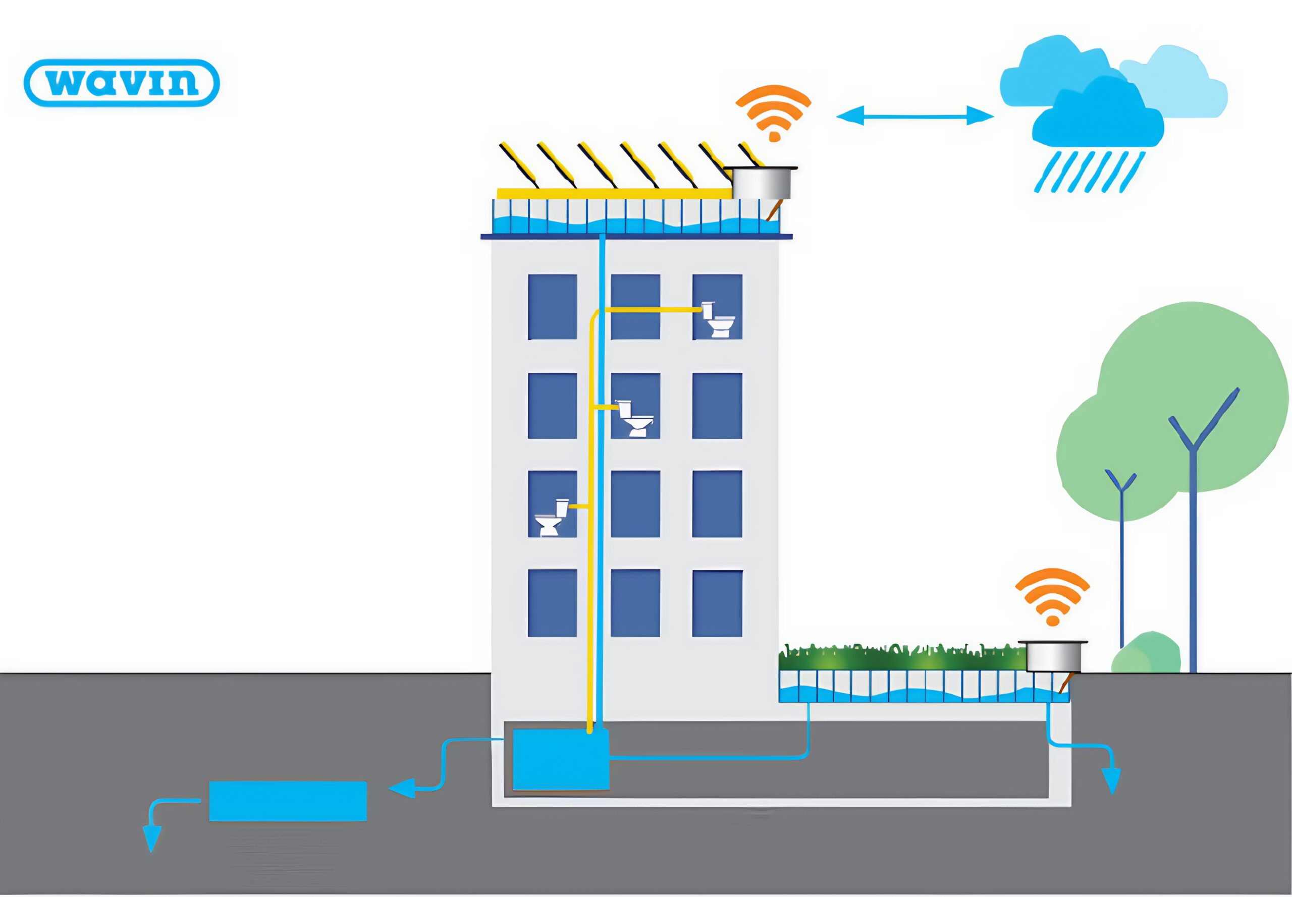 Para controlar las inundaciones en nuestras ciudades, Amanco Wavin desarrolló el sistema de techos verde-azules como solución para mejorar la resiliencia climática, la calidad del aire, el agua de las ciudades y la biodiversidad. Esta solución es la combinación de un techo verde, el cual surge a partir de plantar vegetación con el fin de almacenar un poco de agua de lluvia, y de un nuevo sistema que incluye una unidad de retención de agua que se aplica debajo de las plantas y del suelo. Este ligero reservorio permite almacenar agua de lluvias.