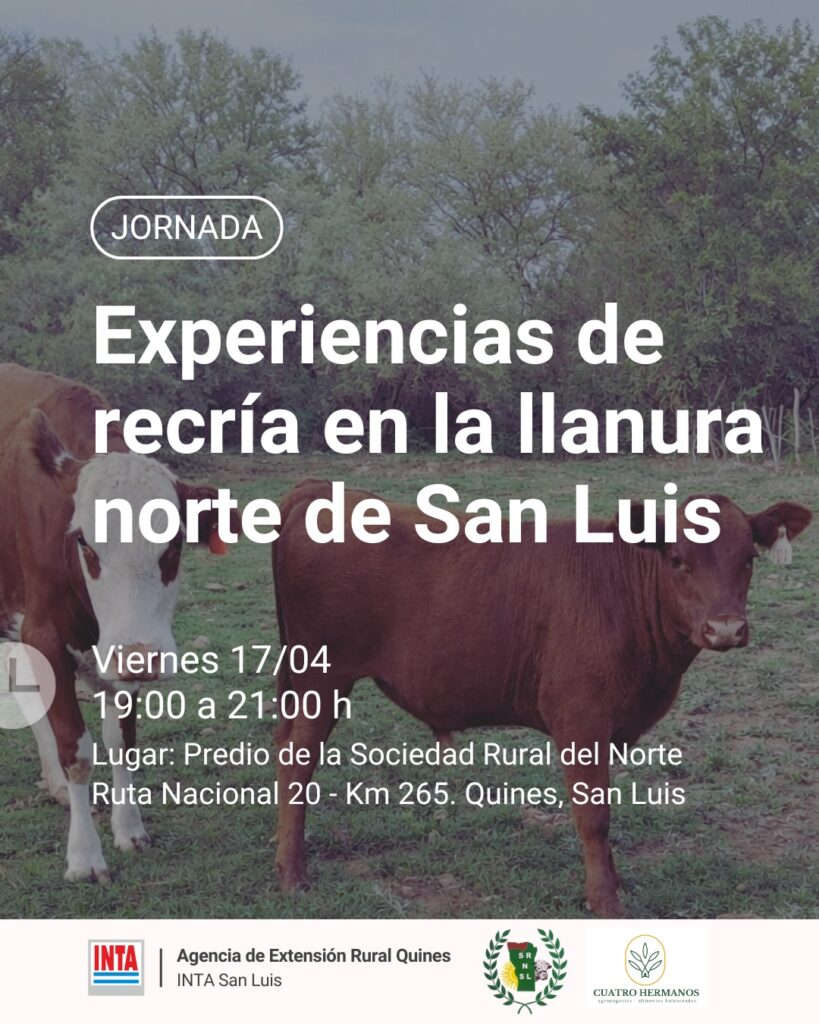 Productores ganaderos y técnicos del norte de San Luis tendrán la oportunidad de actualizar conocimientos y conocer experiencias concretas de manejo durante la jornada técnica “Experiencias de recría en la llanura norte de San Luis”, que se realizará el viernes 17 de abril, de 19 a 21, en el predio de la Sociedad Rural del Norte, ubicado sobre la Ruta Nacional 20, kilómetro 265, en Quines.