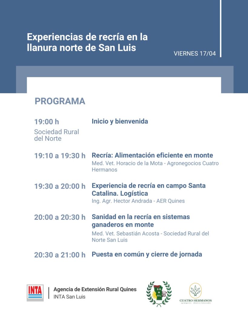 Entre las 19:30 y las 20, el ingeniero agrónomo Héctor Andrada, de la Agencia de Extensión Rural Quines, presentará la disertación “Experiencia de recría en campo Santa Catalina. Logística”, centrada en la organización operativa y el manejo integral de rodeos en establecimientos del norte puntano.