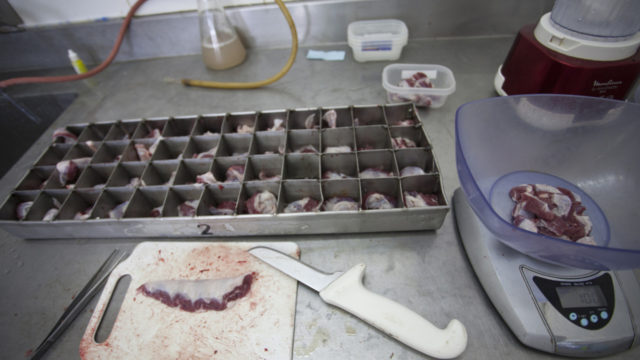 También, en animales silvestres se obtendrá del músculo diafragma, pata delantera, lengua o masetero. En todos los casos, debe pesar alrededor de 40 g. Luego, la muestra debe ser refrigerada hasta su envío al laboratorio (nunca debe ser congelada).