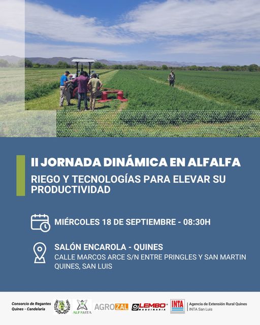 Con una cargada agenda, el 18 de septiembre próximo se realizará en Quines la segunda jornada dinámica en alfalfa, organizada por la Agencia de Extensión Rural del INTA local que contempla exposiciones visitas a campo y demostración de maquinarias.