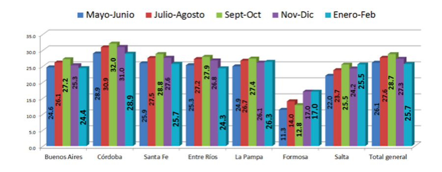 Comparando eficiencias entre las principales provincias productoras, Buenos Aires y Córdoba exhiben los mejores indicadores en esa medición, y el porcentajes es del 81% en ambos casos, seguidos en la medición por Santa Fe y Entre Ríos cuyo porcentual relacional es del 77%,