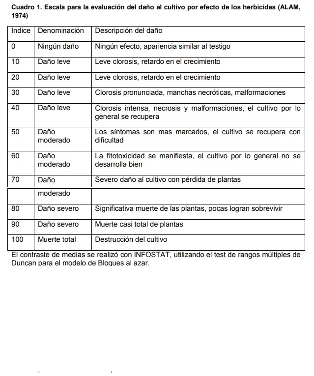 100%: Excelente. ALAM 1974 (Asociación Latinoamericana de la Maleza) . La fitotoxicidad se evaluó también según la escala de ALAM 1974. Cuadro 1.