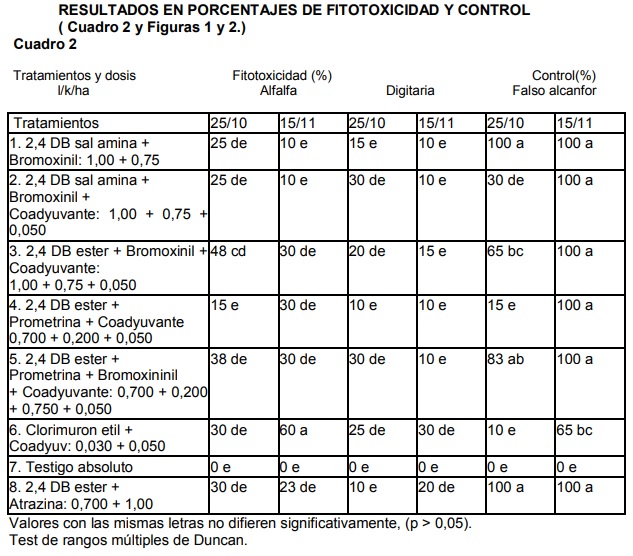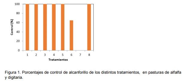 En cuánto a digitaria, los tratamientos 6 y 8 produjeron fitotoxicidad entre el 20 y el 30% del total de plantas presentes. Se concluye que el mayor control del falso alcanfor con la menor fitotoxicidad para alfalfa y digitaria se alcanzó con el tratamiento 1 y 2.