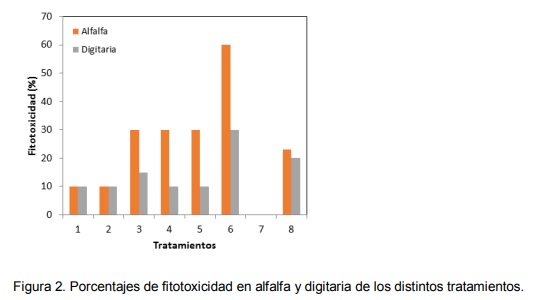 3, 4 y 5 provocaron una fitotoxicidad del 30% en alfalfa, mientras que los tratamientos 1, 2 y 7 (testigo) prácticamente no provocaron daño a la alfalfa.