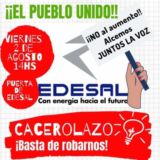“Ante la solicitud presentada por parte de la distribuidora de energía de la provincia Edesal S.A. a la Comisión Reguladora Provincial de la Energía Eléctrica (CRPEE), en la Audiencia Pública el pasado Viernes 26 de Julio de 2019, en la que propone un aumento del valor Agregado de Distribución (VAD) del 63,67%, que de concederse impactará en un 30% en las tarifas de luz, los usuarios de San Luis, en pleno uso de nuestros derechos, nos manifestamos en contra de este pedido de aumento que ha presentado la empresa Edesal S.A, al cual calificamos de ‘irracional’, teniendo en cuenta la situación inflacionaria por la cual estamos atravesando.