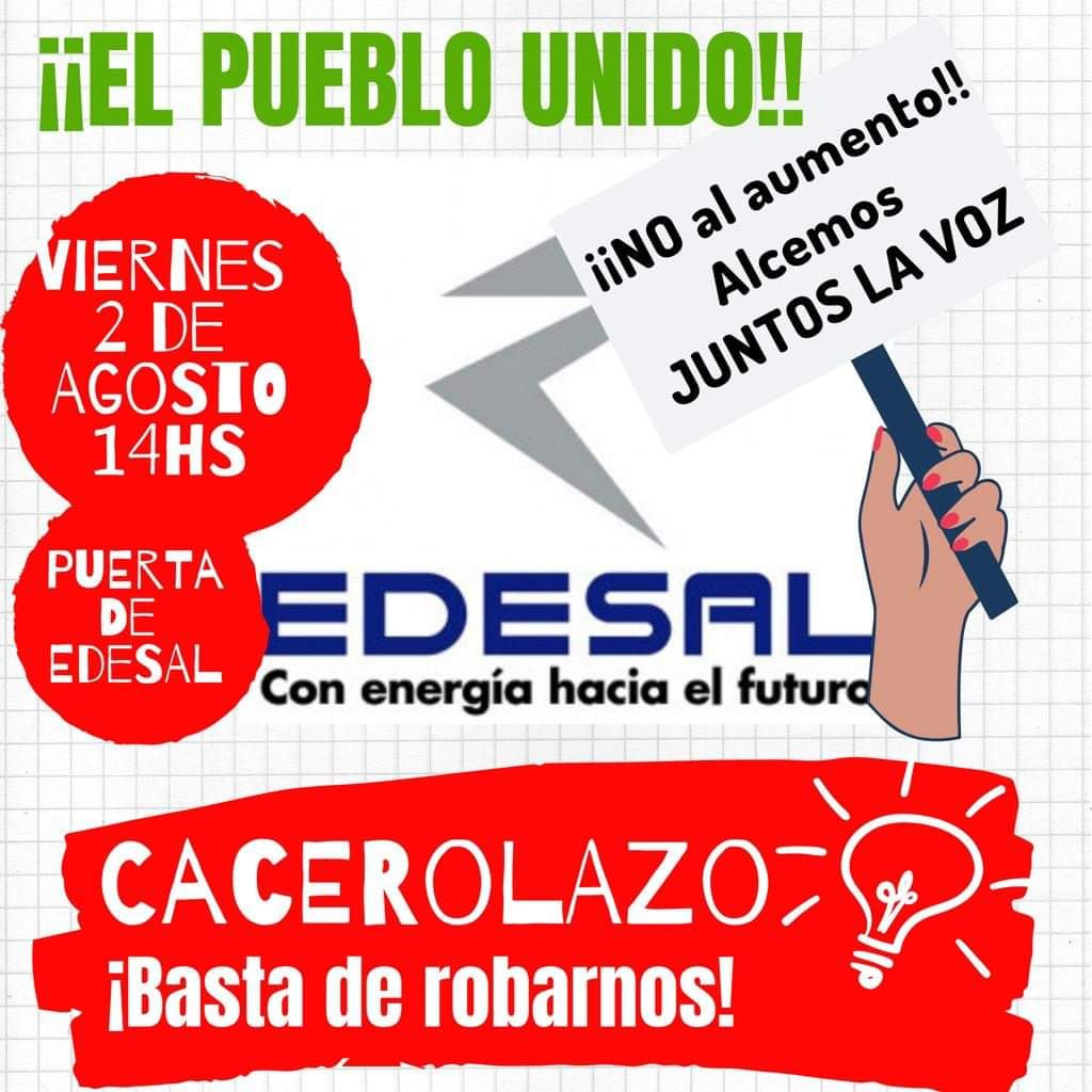 Por todo lo manifestado y en señal de protesta, los usuarios y consumidores del servicio de energía eléctrica, realizaremos un apagón masivo de una hora, el día viernes 2 de agosto en el horario de 21hs a 22hs”.