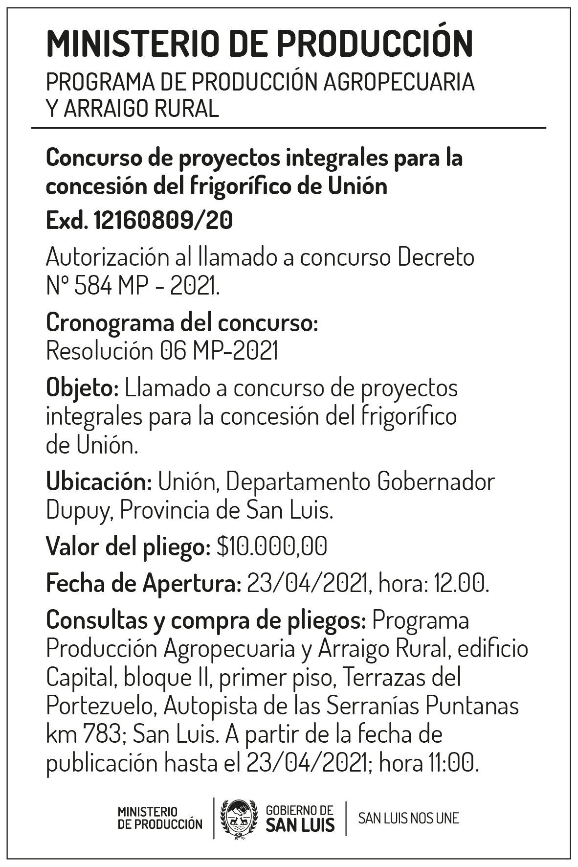 El gobierno de San Luis llamó formalmente a concurso de proyectos integrales para la concesión del frigorífico de Unión, en el sur provincial, el único de los siete que posee la provincia preparado para el tránsito federal y con capacidad para faenar hasta 120 bovinos diarios.