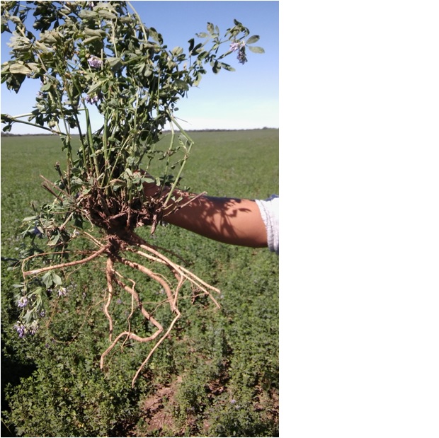Relata que el objetivo de esta intervención es extraer agua del suelo y en este aspecto la alfalfa es un “excelente consumidor de agua”. En dos años ya se tiene extracción, mientras que con la forestación recién después de los cinco años comienza el consumo.