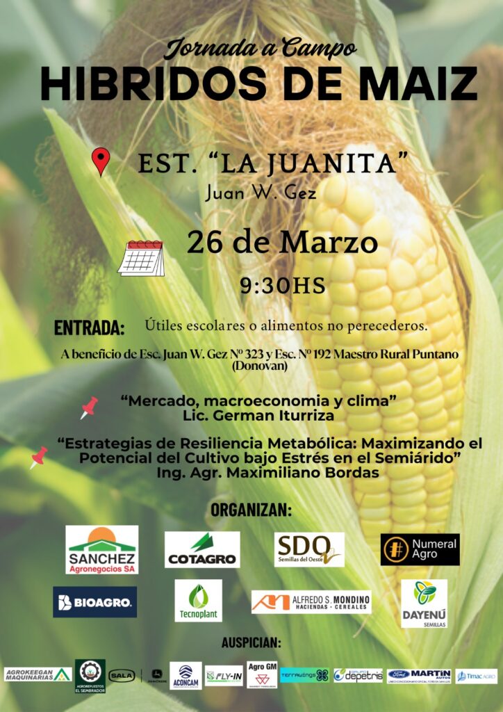 El próximo 26 de marzo, desde las 9:30 horas, se realizará una destacada jornada a campo sobre híbridos de maíz en el establecimiento “La Juanita”, ubicado en la localidad de Juan W. Gez, en la provincia de San Luis.