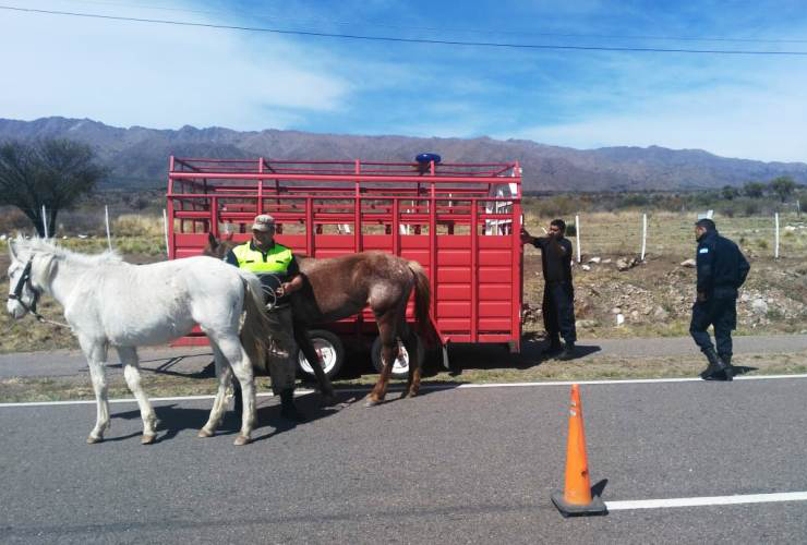 A dos días de imponer duras multas por animales sueltos en rutas y caminos, para evitar accidentes de tránsito, efectivos de la Comisaría 44ª de Villa de la Quebrada y de la Policía Ambiental, conjuntamente con integrantes del Ente Control de Rutas, secuestraron este jueves cinco animales que deambulaban sobre la vía, cerca de Villa de la Quebrada.