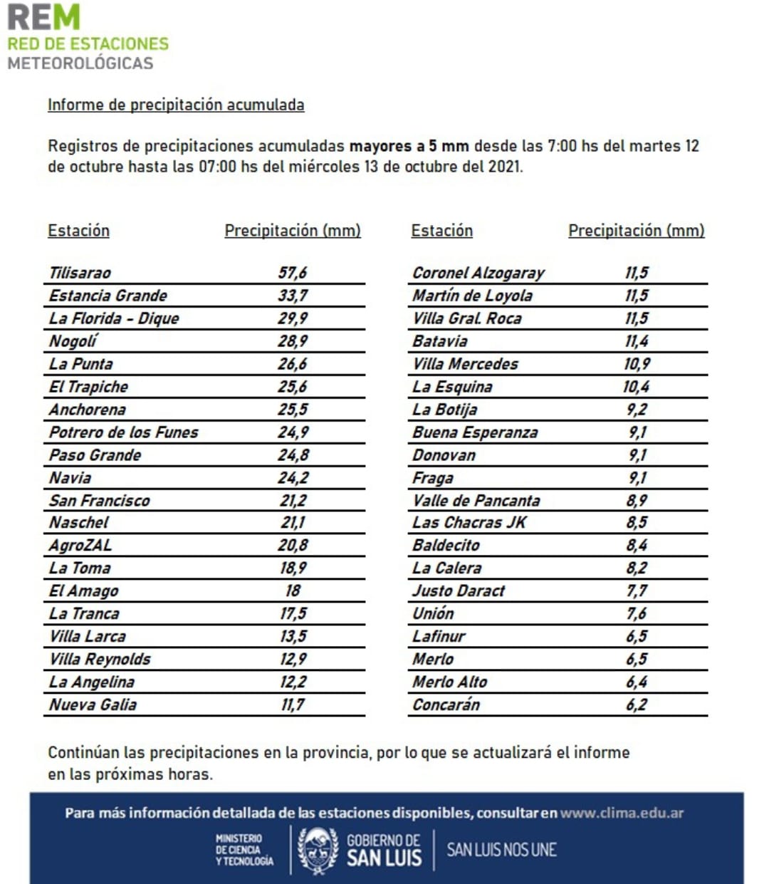 Un reporte de la Red de Estaciones Meteorológicas de la provincia indicó que en 40 localidades y parajes llovió por encima de los 6 milímetros y que Tilisarao fue la que acumuló más agua, con 57,6 milímetros.