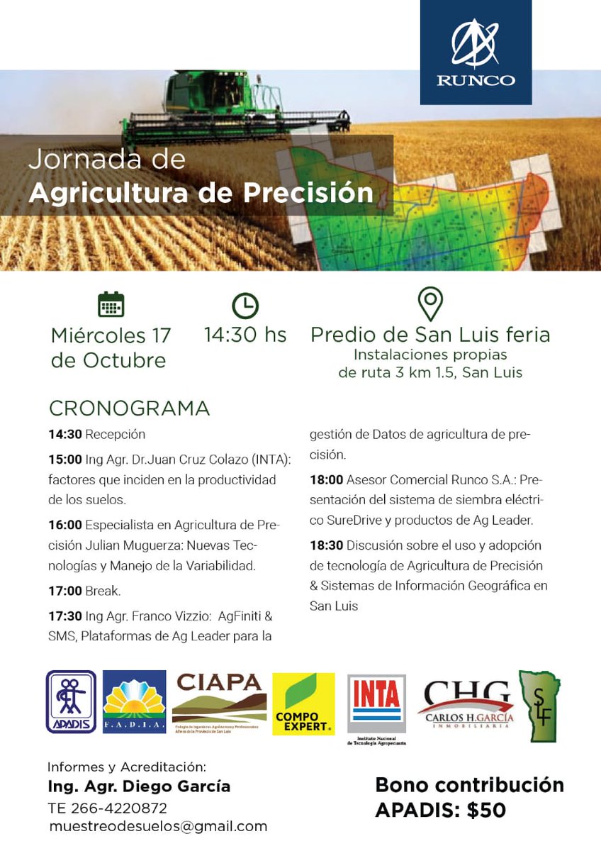 El próximo 17 de octubre expondrán tres especialistas en un encuentro sobre agricultura de precisión, que se desarrollará de 14:30 a 18:30 en las instalaciones de San Luis Feria, en la capital puntana.
