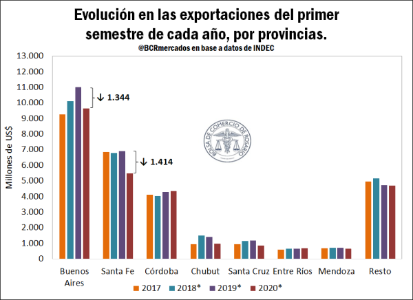 Las exportaciones del primer semestre de 2020 en Argentina se han ubicado en los US$ 27.336 millones. Dicho guarismo semestral es un mínimo de la última década y comparado con el año anterior, representa una caída del 11% en el valor exportado que equivale a unos US$ 3.454 millones. La composición de tal retracción se deriva de una caída del 6,3% en el índice de cantidades y del 5% en el índice de precios obtenidos por nuestros productos en el extranjero. Sobre la base de tales resultados, se prosigue con un análisis del desempeño exportador argentino a nivel provincial y específicamente de la provincia de Santa Fe.