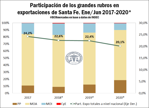 En el siguiente gráfico, se puede observar la evolución en la participación de los diversos rubros entre enero y junio de cada año, respecto al total exportado por la provincia de Santa Fe. Desde el año 2018 se vislumbra cierto cambio en la composición del valor exportado por dicha provincia Pampeana. Se registra una creciente participación relativa de las exportaciones de Productos Primarios que han pasado de representar el 9% en 2018 hasta 18,7% en 2020, es decir, un importante aumento de 9,7 puntos porcentuales (p.p). Si bien han coadyuvado a mantener el valor exportado, dicho rubro le ha ganado terreno al aporte relativo de las MOI que disminuyeron 6,8 p.p hasta 9,6%, las MOA con 71,3% de participación cayeron 2,5 p.p y los CyE con 0,4% presentaron una merma de 0,3 p.p.
