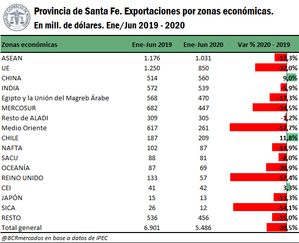 Indicador N°1. La provincia de Santa Fe se mantiene en el segundo puesto del ranking exportador con US$ 5.486 millones, aunque en el primer semestre de 2020 es la jurisdicción que más retrocedió en su valor exportado con US$ 1.414 millones.