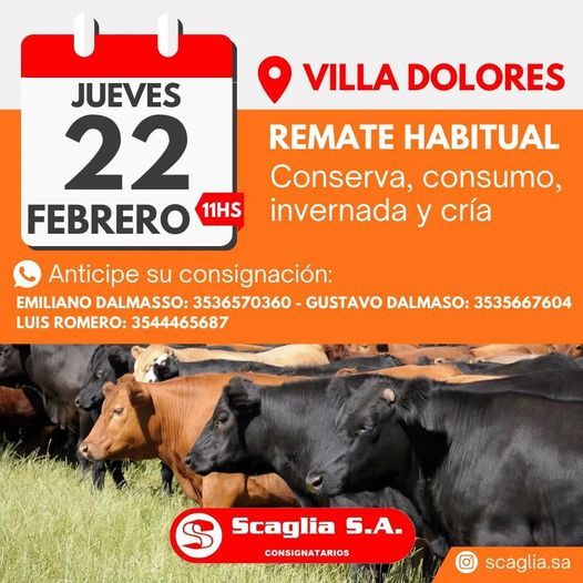 Inicio Ganadería Scaglia remata este jueves 700 cabezas en Villa Dolores Ganadería Scaglia remata este jueves 700 cabezas en Villa Dolores Feb 21, 2024 FacebookTwitterPinterestWhatsApp La consignataria Scaglia SA subastará este jueves en Villa Dolores 700 cabezas de conserva, consumo e invernada y cría. El remate habitual de la firma cordobesa comenzará a las 11:00 y se realizará en el predio de la Sociedad Rural de Villa Dolores.