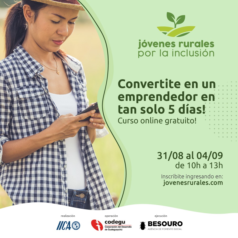 Una capacitación gratuita en el desarrollo de emprendimientos, creada para jóvenes que viven en zonas rurales. El curso utiliza la experiencia de los participantes para crear un negocio a bajo costo o sin costo. Al final del curso, el estudiante está listo para sacar su negocio al mercado.