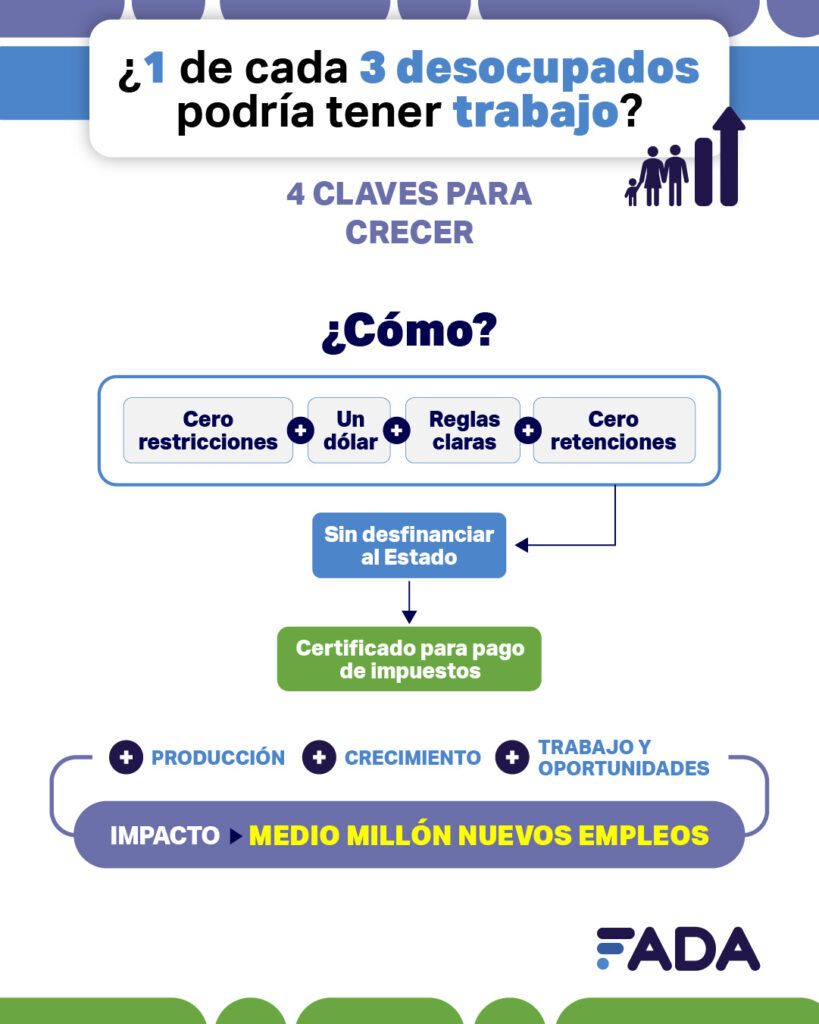 «Hay 4 políticas de base que nos pueden ayudar: Cero retenciones, cero restricciones, un dólar y reglas de juego claras. Proponemos que se eliminen los derechos de exportación en todos los productos, menos en soja. Que bajen a 0 de manera inmediata y a 21% en el caso de la soja”, propuso FADA. “Pero para que esto sea factible es necesario amortiguar el impacto fiscal y mostrar todos los impactos positivos que tendría la medida, como la generación de medio millón de puestos de trabajo, el equivalente a 1 de cada 3 desocupados de Argentina”, analizó David Miazzo, Economista Jefe de FADA.