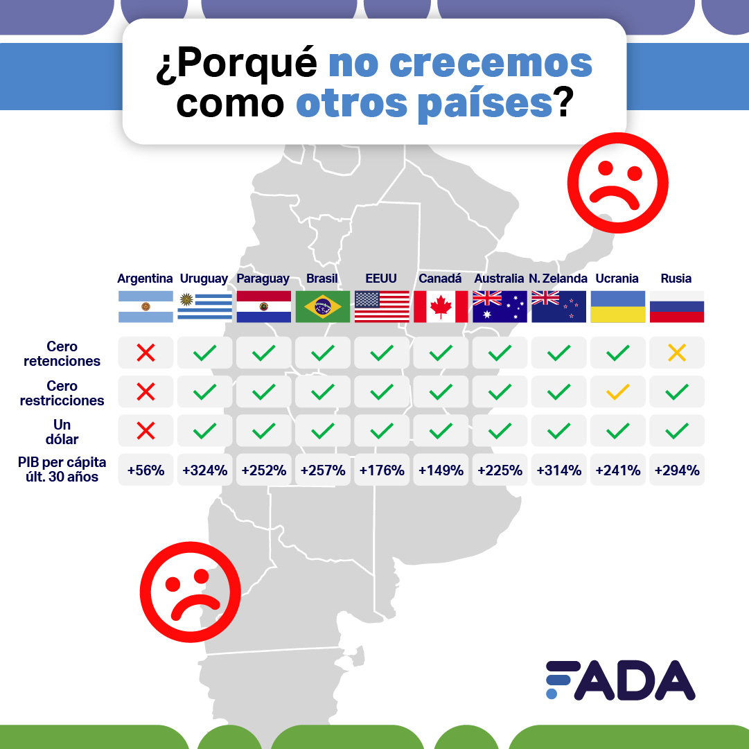 Hay otro dato más sorprendente aún: en los países donde NO se aplican retenciones, se registra un gran crecimiento del PBI. En Argentina el PBI por habitante ha crecido poco, sólo un 56% en los últimos 30 años. En cambio, en países que facilitan producir, exportar y que crearon políticas más adecuadas, crecieron mucho más. Entre ellos, Uruguay creció 324%, Paraguay 252%, Canadá 149% y Ucrania 241%, entre muchos más”, advirtió Miazzo.