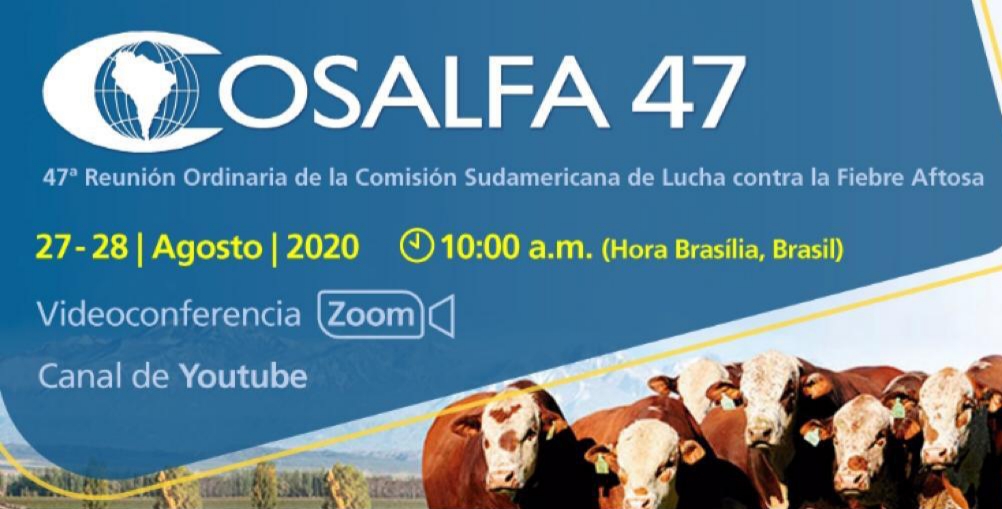 La 47ª Reunión Ordinaria de la Comisión Sudamericana de Lucha contra la Fiebre Aftosa (Cosalfa) se llevará a cabo los días 27 y 28 de agosto, de manera virtual a través de la plataforma Zoom, y será transmitida por medio del canal de Youtube del Centro Panamericano de Fiebre Aftosa de la Organización Panamericana de Salud (Panaftosa/OPS)