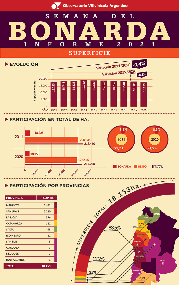 Desde el Observatorio Vitivinícola Argentino se sumaron a los festejos por la Semana del Bonarda con la presentación de una infografía muy completa, donde se especifican detalles de producción, comercialización, cosecha y precios, para entender los datos de los últimos 10 años de esta cepa, desde la viña a la góndola.