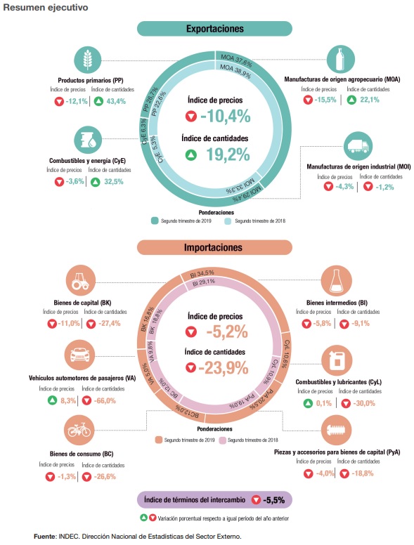 En el segundo trimestre de 2019 sobre la base de igual trimestre del año anterior, el índice de precios de exportación disminuyó 10,4% por la caída registrada en manufacturas de origen agropecuario (MOA) (-15,5%), productos primarios (-12,1%), manufacturas de origen industrial (MOI) (-4,3%) y combustibles y energía (-3,6%). El índice de cantidad de exportación se incrementó 19,2% en comparación con igual trimestre del año anterior año anterior, por los aumentos registrados en productos primarios (43,4%), combustibles y energía (32,5%) y manufacturas de origen agropecuario (22,1%), mientras que las manufacturas de origen industrial disminuyeron (-1,2%).