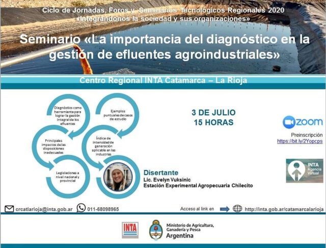 El Centro Regional Catamarca – La Rioja en el marco de las Jornadas, Foros y Seminarios Tecnológicos 2020 presenta el tercer seminario en recursos hídricos “La importancia del diagnóstico en la gestión de efluentes agroindustriales” que se llevará a cabo el día 3 de julio a las 15 horas de manera virtual, a través de la plataforma Zoom.