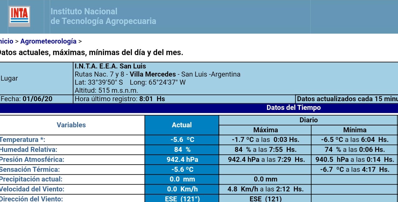 Mientras que si observamos el registro tomado por el observatorio que tiene INTA en Villa Mercedes, esta ciudad fue la más fría de la provincia de San Luis al iniciarse el mes de junio: -6.5°.
