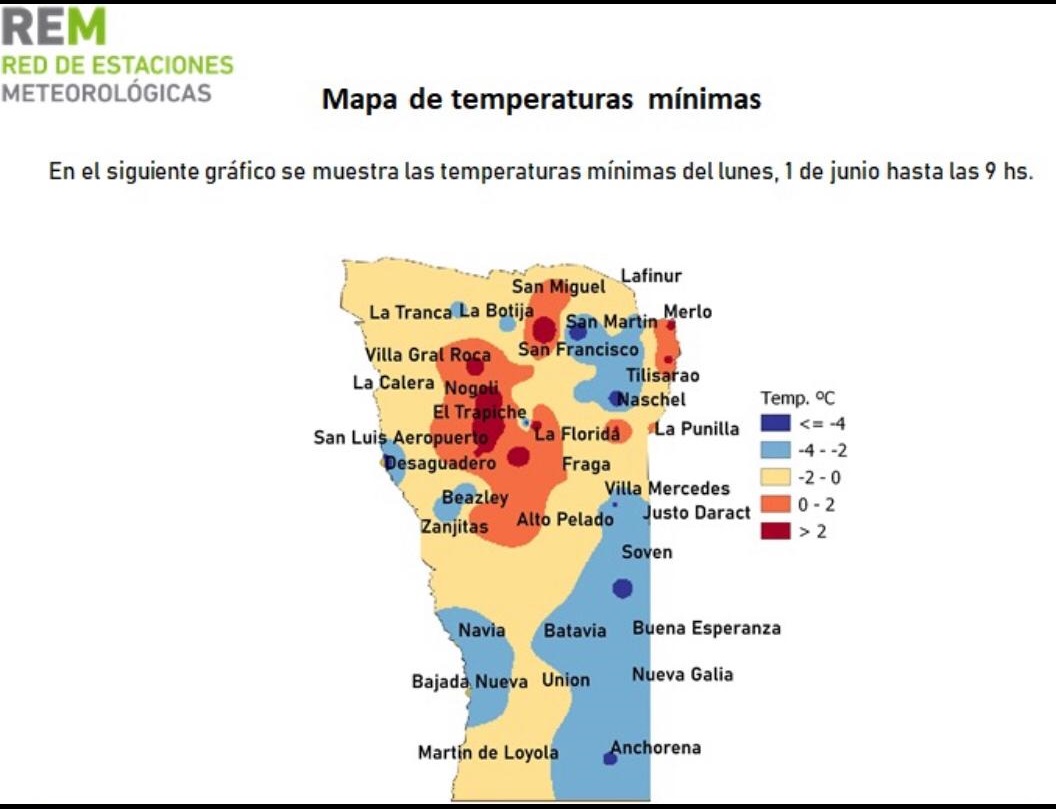 En el sur provincial sí hizo frío y con temperaturas bajo cero, aunque no tan gélidas como las de ayer 31 de mayo. Hubo un corrimiento del frío hacia la zona central y serrana de la provincia. También hacia el este, dado que hoy lunes la línea de Anchorena, Nueva Galia y Buena Esperanza tuvieron mínimas más bajas (alrededor de -4°) que Martín de Loyola (-0.5).