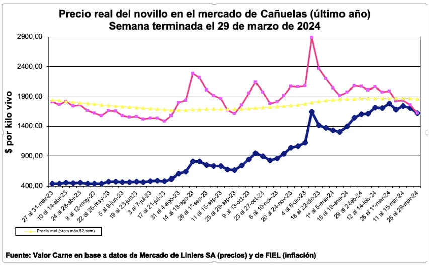 A pesar de que los ingresos en el mercado de Cañuelas fueron 30% menores al promedio semanal de un año, se registraron bajas nominales de hasta el 6%. El precio real del novillo cayó por octava semana consecutiva y se ubica 45% por debajo del récord de diciembre.