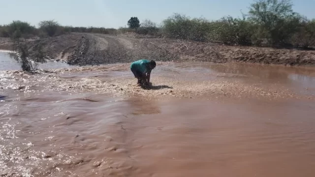 Para que esto fuera posible, se realizó una limpieza de cauces, que llevaban años sin ver una gota de agua. “Gracias a nuestro querido vecino de Sarmiento Biviano Zarate que brindó su indispensable orientación para las tareas realizadas por el licenciado Carmona junto al secretario de Gobierno Juan Femenia, el diputado Ing. Andrés Castro y concejal José Luis Fernández”, indican desde la comuna.