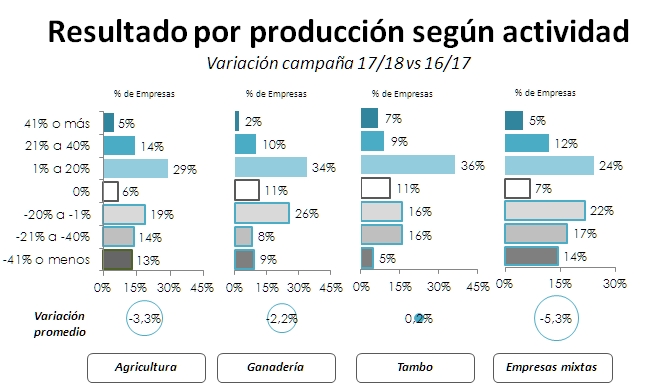 El informe de la entidad técnica reveló también que las empresas agrícolas registraron en 2017/18 un resultado por producción 3,3% inferior respecto de 2016/17, mientras que esa caída en las ganaderas y mixtas fue de 2,2% y 5,3% respectivamente.