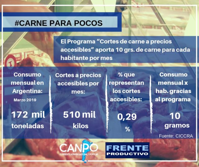 En lo que respecta a la carne, se anunció el “Cortes de carne a precios accesibles”, en donde en un acuerdo público-privado se pone a un precio diferenciado 120 mil kg de carne semanales. Para tener una idea de cuánto representa ese total, en el mes de marzo (según datos de CICCRA) en el país se consumieron 172 mil “toneladas” en el mercado interno por lo que lo ofrecido por el gobierno en su gran programa representa apenas un 0,29% de lo consumido, 10 gramos de carne por habitante al mes.
