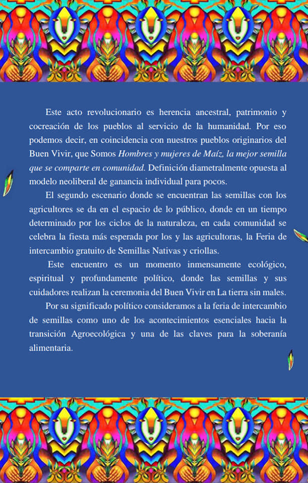 El autor propone que con las semillas en manos de los pueblos originarios, los/as campesinos/as y los/as agricultores/as de Latinoamérica, nos puede ayudar a pensar y tratar de sentir qué tipo de vida deseamos de verdad, si la que nos venden las grandes corporaciones por tv o una propia que sea posible y más agradable.