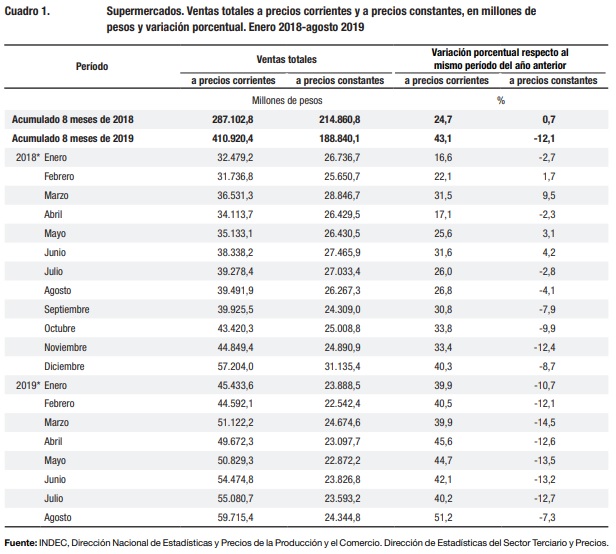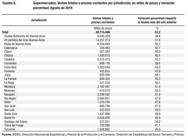 Del total de la facturación en agosto, en los supermercados las ventas realizadas en efectivo ascendieron a 19.743.893 pesos, que representa un 33,1% del total y un aumento del 43,2%, comparado con agosto del año anterior.
