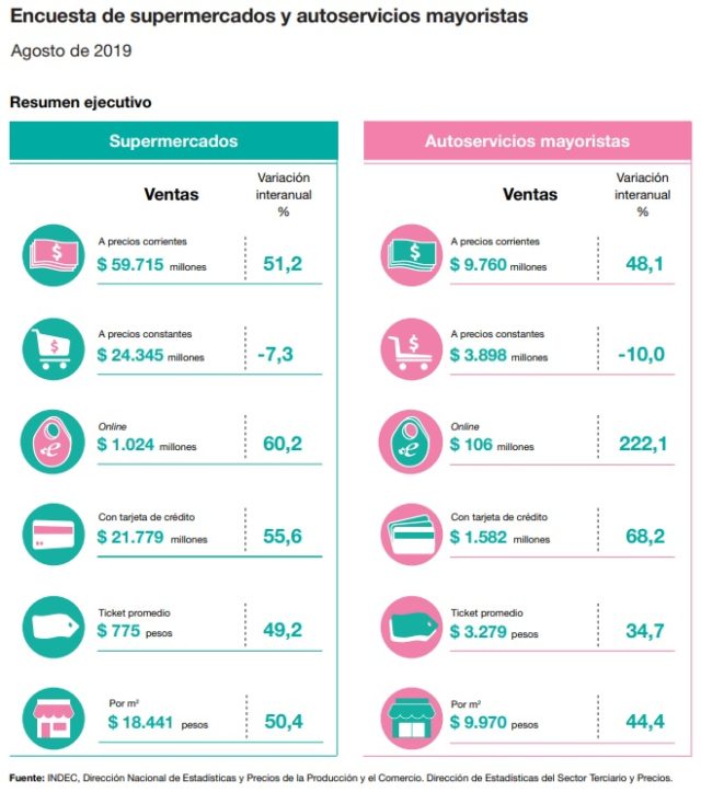 Las ventas en supermercados cayeron 7,3% en agosto último y en los centros de compras o shoppings bajaron 6,7% en forma interanual, y acumulan 14 meses de continua caída, informó este miércoles el INDEC.
