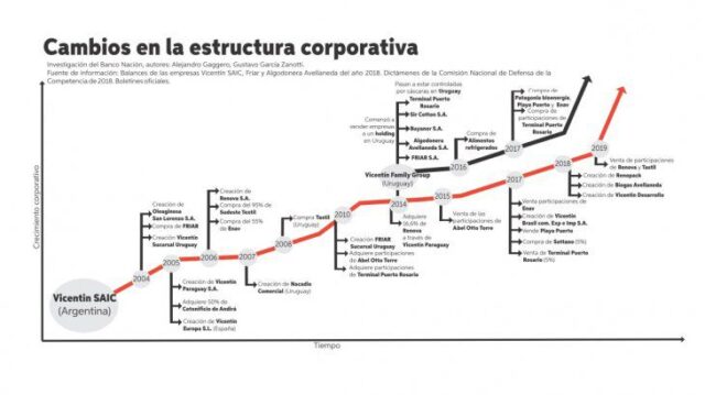 “Estas empresas fueron adquiriendo participaciones en firmas del grupo que hasta ese momento estaban controladas por Vicentin SAIC”, indicó el informe. Tal como se muestra en la evolución de la estructura corporativa, la dinámica de este proceso de vaciamiento de Vicentin SAIC en detrimento de la estructura paralela, que está controlada principalmente por Vicentin Family Group, fue especialmente intensa en los años 2014 y 2017.