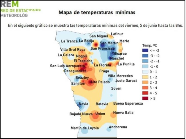 La línea del oeste, en el límite con Mendoza, a lo largo del río, en Desaguadero, La Tranca y La Calera, la mínima rondó por 0°. En Merlo y Villa Larca llegó a 2°.