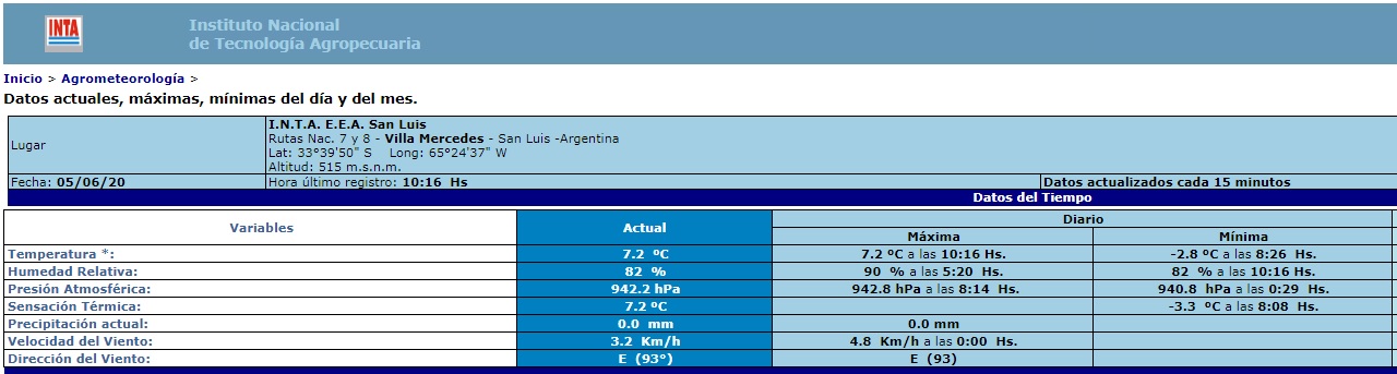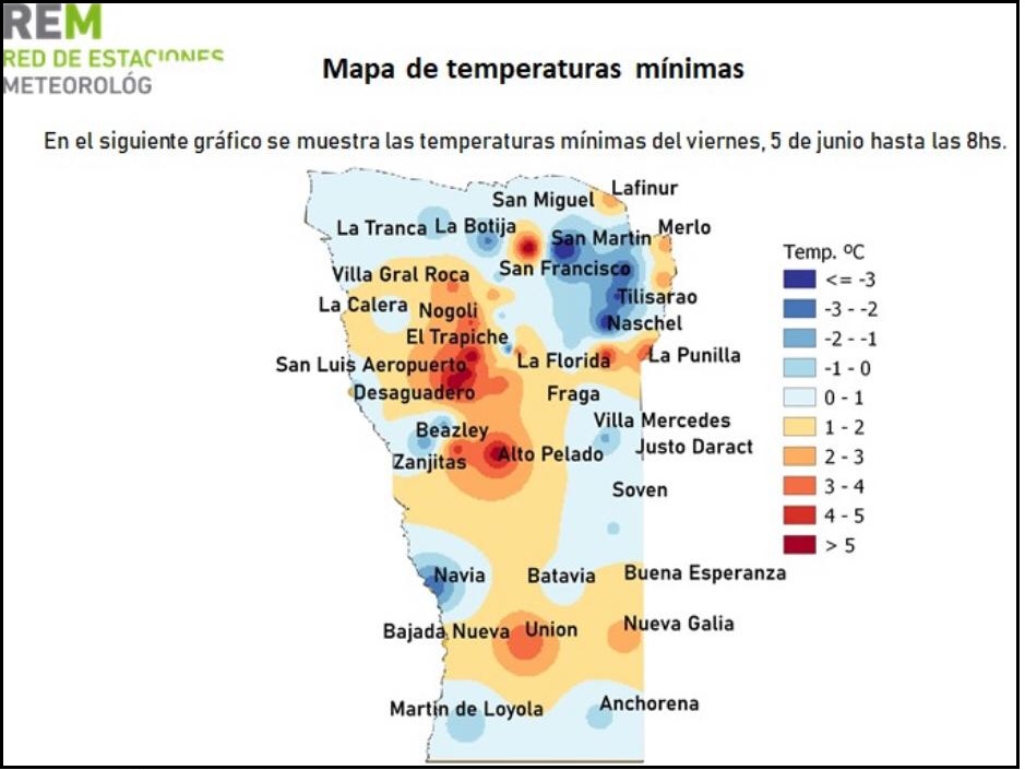 Villa Mercedes, como siempre, tiene distintos registros según quien y dónde tome las marcas. De acuerdo con la Red de Estaciones Meteorológicas, la mínima fue de -0.6°, mientras que INTA registró -2.8°. En Justo Daract, La Angelina y Soven, la temperatura estuvo alrededor de 0°.