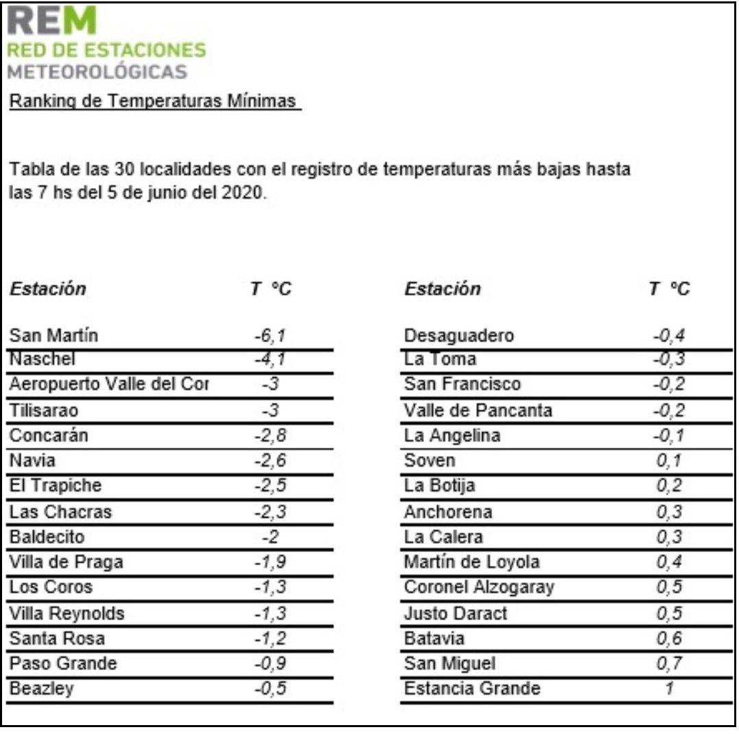 En la línea del Valle del Conlara la mínima, al igual que siempre, la tuvo Naschel con -4.1°, mientras que en Aeropuerto Valle del Conlara y Concarán llegó a -3.5°, en Tilisarao -3° y en La Toma, -0.3.